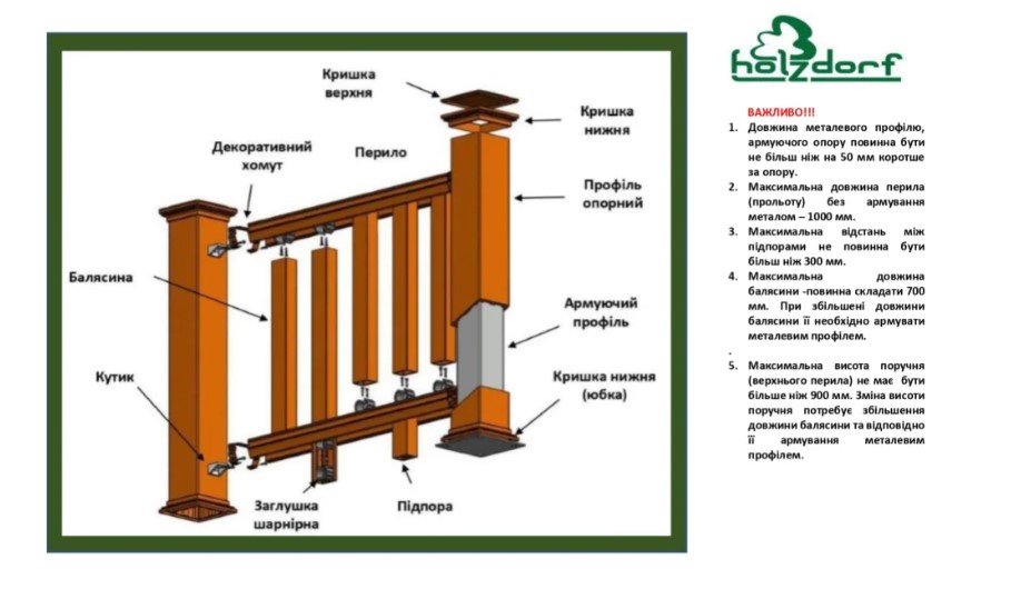 Декоративні огорожі HOLZDORF (ZavodDPK) – спеціально сконструйовані для ефектного та стриманого оформлення терас, майданчиків, альтанок, відкритих літніх кафе, причалів, а також тих місць, де потрібно естетично підкреслити завершеність споруди.