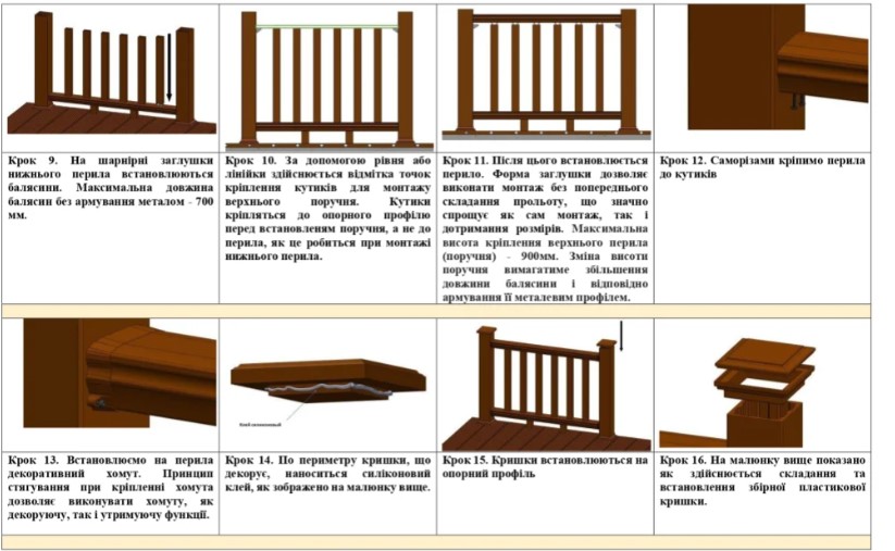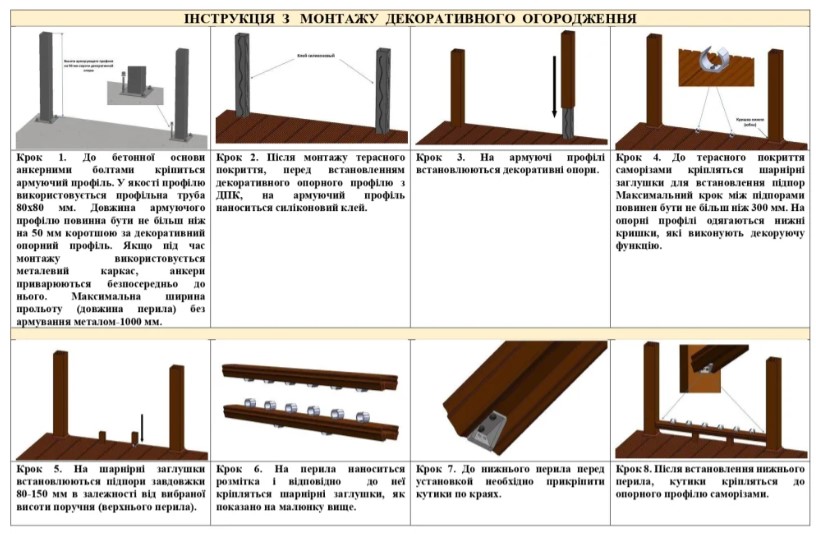 Зручність та простота монтажу декоративних огорож з дерево-полімерного композиту максимально спрощують процес складання. Для збирання системи ми рекомендуємо використовувати звичайні столярні інструменти. Незважаючи на те, що продукт є абсолютно безпечним, при проведенні робіт ми рекомендуємо використовувати засоби індивідуального захисту: рукавички та захисні окуляри.